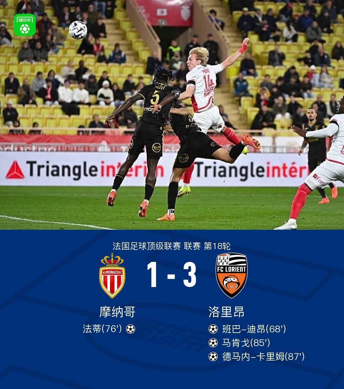 北京时间1月17日,法国足球甲级联赛第18轮,摩纳哥主场迎战洛里昂。比赛中,洛里昂率先打破僵局,班巴-迪昂接巴莫-梅特助攻完成破门。随后,法蒂为摩纳哥扳平比分。比赛进入尾声阶段,德马内-卡里姆送出助攻,马肯戈折射破门帮助洛里昂再度领先。紧接着,诺亚-卡迪乌传中精准制导,德马内-卡里姆兜射破门将比分进一步扩大。最终全场比赛结束,摩纳哥以1比3不敌洛里昂。