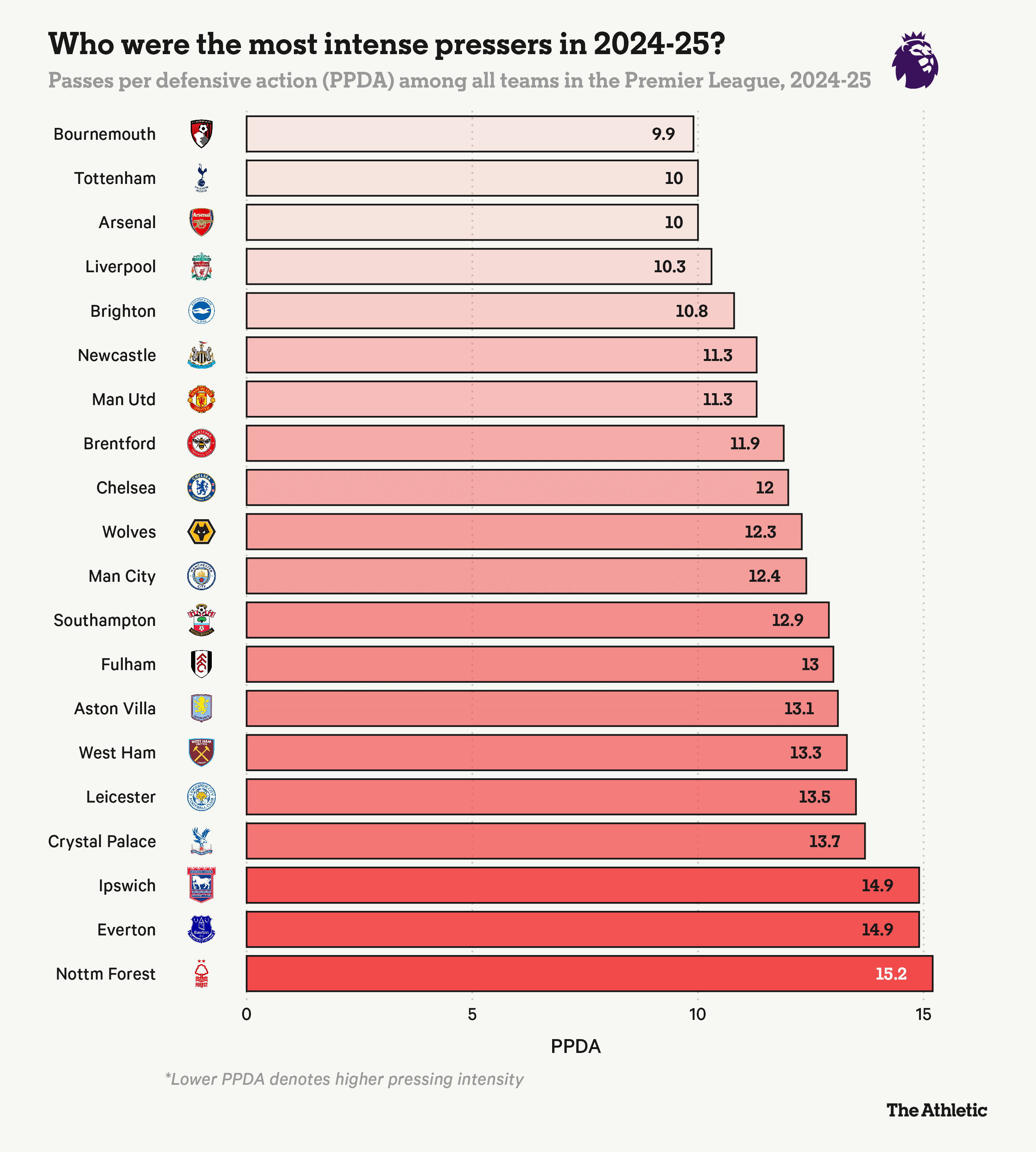 森林队能否应对这种增加的工作量还有待观察。热刺的高强度跑动源于波斯特科格鲁希望在高位逼抢并夺回球权。相比之下,森林队上赛季在逼抢方面并不积极,每进行一次防守动作平均允许对手传球15次,为联赛最高。